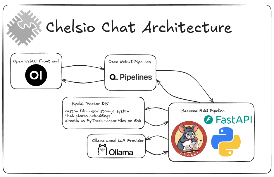This summer I interned at Chelsio Communications, a semiconductor company based in Sunnyvale that specializes in high-performance Ethernet networking and storage solutions. My project: build a production-ready internal chatbot powered by an LLM and a private knowledge base, entirely on-premise with no external APIs.
